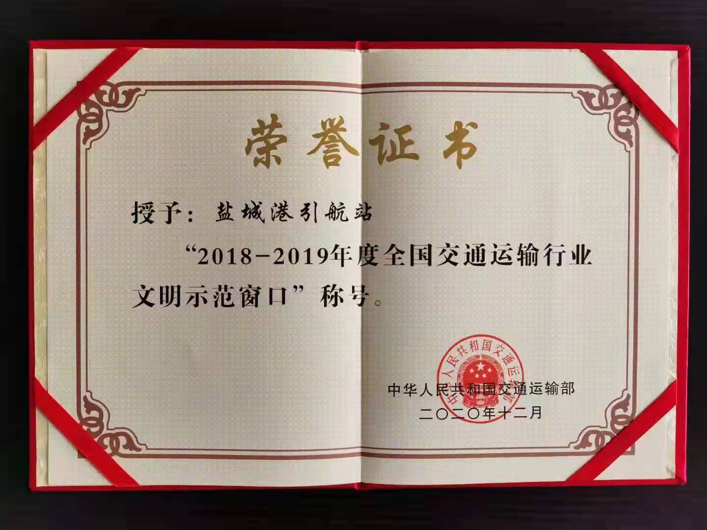 2020年12月,鹽城港引航站獲得“全國交通運輸行業文明示范窗口”榮譽。