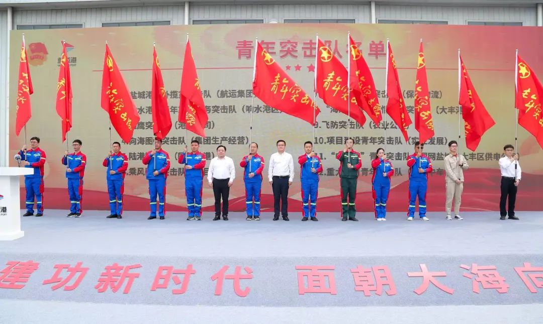 活動中,與會領導為12個圍繞服務重大項目而組成的青年集體突擊隊進行授旗,青年突擊隊、青年文明號代表作表態發言,并舉行了“強國復興有我 青春燃在海港”鹽城港青年宣誓儀式。