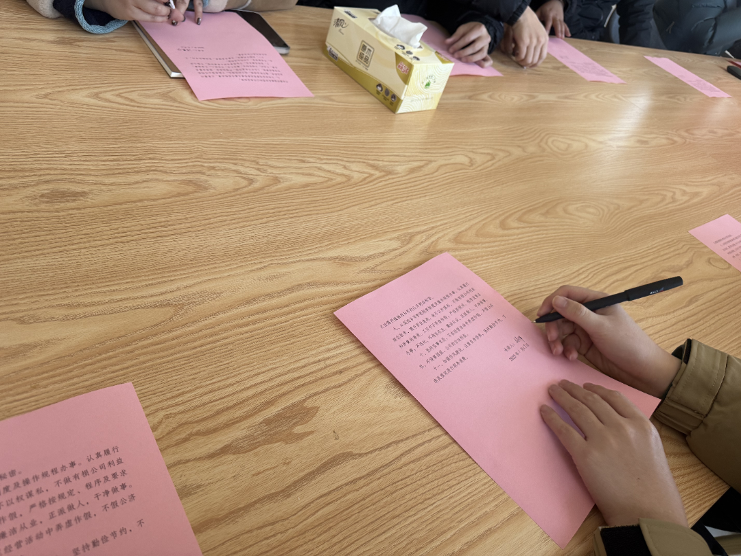 青年們現場簽訂廉潔從業書并為每位青年送上廉潔日歷及戒尺,進一步強化青年們廉潔自律思想意識,進一步提醒青年們把廉潔承諾轉化為工作動力和成效,做遵紀守法、嚴格自律的表率,營造風清氣正的干事氛圍。