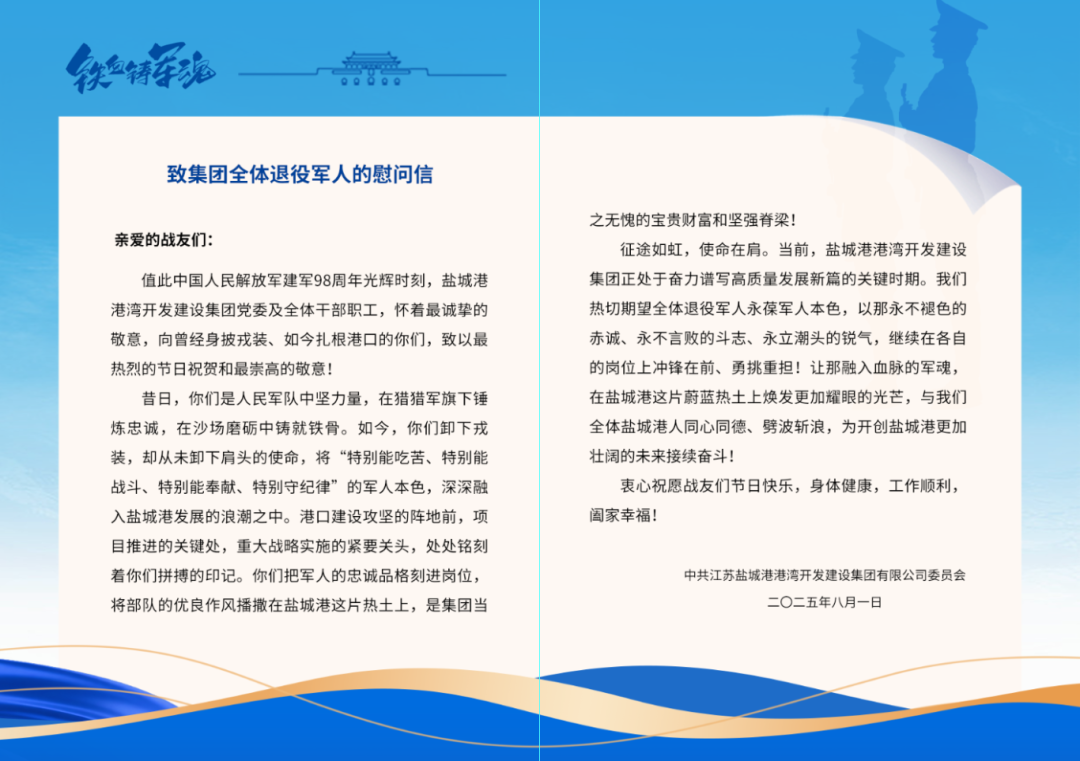 港灣集團(tuán)、物流集團(tuán)向奮戰(zhàn)在各崗位的退役軍人同志們送上慰問信,以筆墨傳遞溫暖,以文字致敬榮光,凝聚著對(duì)退役軍人“轉(zhuǎn)業(yè)不轉(zhuǎn)志、退伍不褪色”精神品格的崇高禮贊,飽含著對(duì)退役軍人群體“永葆軍人本色、爭當(dāng)行業(yè)標(biāo)兵”的殷切期許。