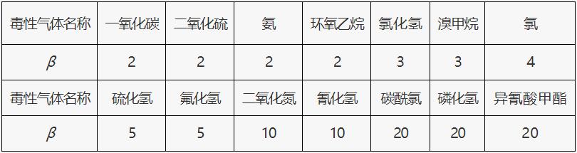 表1 常見(jiàn)毒性氣體校正系數(shù)β值取值表