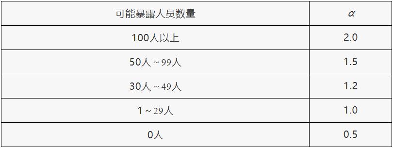 根據(jù)重大危險(xiǎn)源所在港口企業(yè)作業(yè)區(qū)邊界向外擴(kuò)展500米范圍內(nèi)常住人口數(shù)量,設(shè)定暴露人員校正系數(shù)(α)值,見(jiàn)表3。