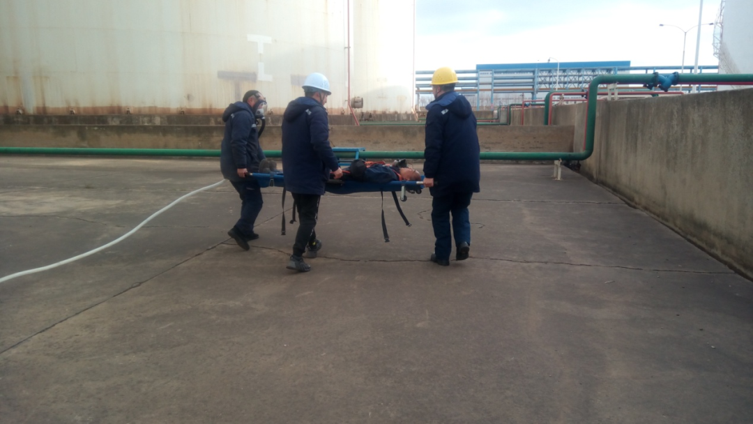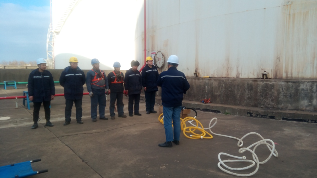 本次演練主要通過模擬作業人員進入儲罐作業時,未按公司操作規程進行,在發生的受限空間事故時,如何通過正確使用應急救援物資在現場進行救援。