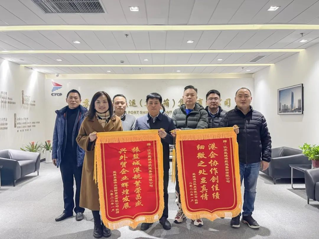1月25日,農(nóng)歷小年這一天,南京海聆夢、鹽城東源偉業(yè)和鹽城海貝玩具三家公司不約而同來到鹽城港航運集團,分別將寫有“高效服務(wù)心系企業(yè)”、“振鹽城港航繁榮昌盛,興外貿(mào)企業(yè)輝煌發(fā)展”、“港企協(xié)作創(chuàng)佳績,細微之處顯真情”的錦旗送到了公司班子手中,感謝航運集團一年來在貨物出運上給予的大力支持。