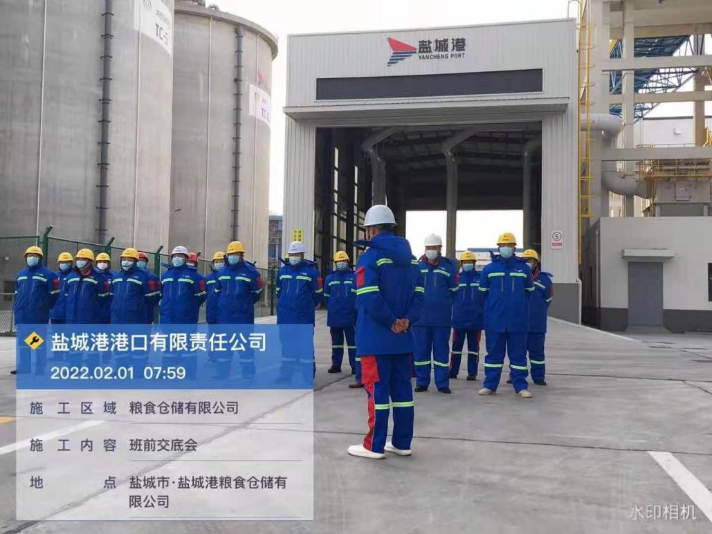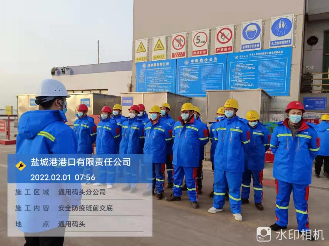 農歷正月初一,鹽城港大豐港區港口公司各子(分)公司在碼頭(作業現場),如往常一樣準點開始作業班前會,進行安全生產、疫情防控工作交底。