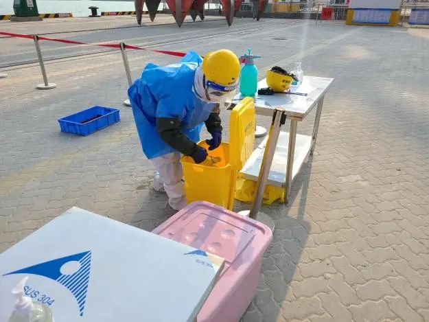 本次演練從實戰出發,結合港口實際,檢驗港口一線防疫工作人員對核酸檢測呈陽性人員的發現、隔離、疫情報告、轉運、個人防護及消殺等能力。