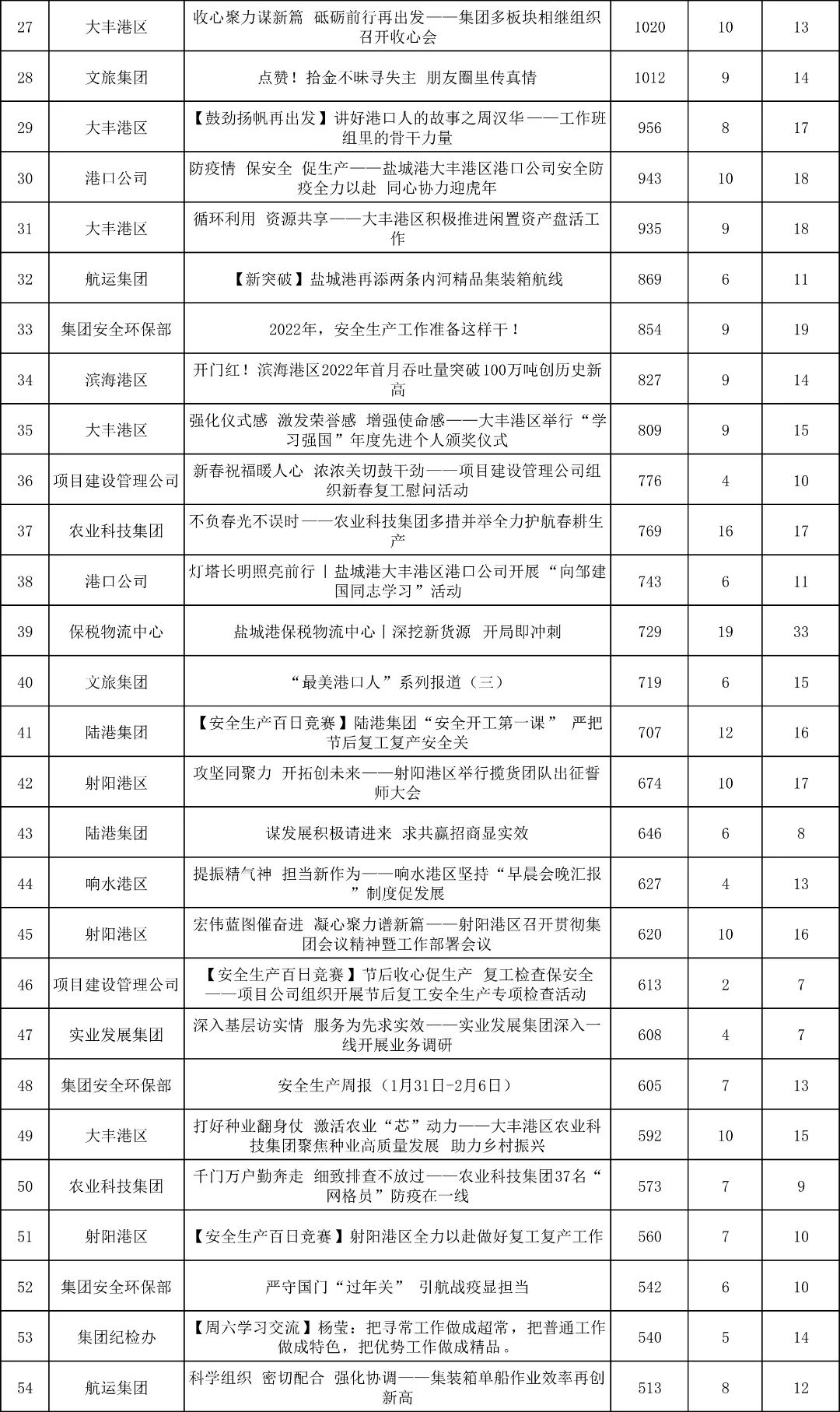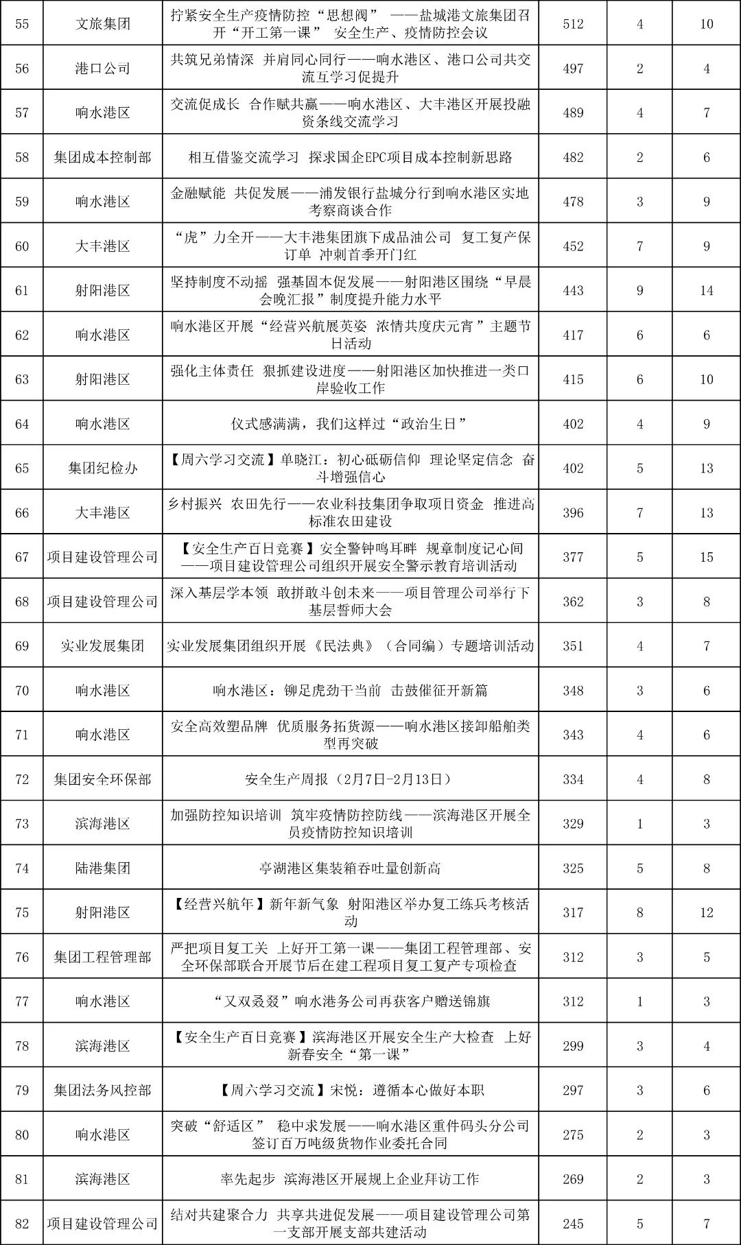 “首季開(kāi)門紅”向來(lái)是新聞報(bào)道的高產(chǎn)期,特別是一線生產(chǎn)單位亮點(diǎn)頻出。從二月份稿件數(shù)據(jù)統(tǒng)計(jì)來(lái)看,大豐港區(qū)依然蟬聯(lián)第一“寶座”,發(fā)稿18篇;港口公司繼續(xù)發(fā)力,成稿11篇,位列第二;響水港區(qū)緊隨其后,發(fā)稿9篇。其他單位齊齊發(fā)力,紛紛積極供稿!
