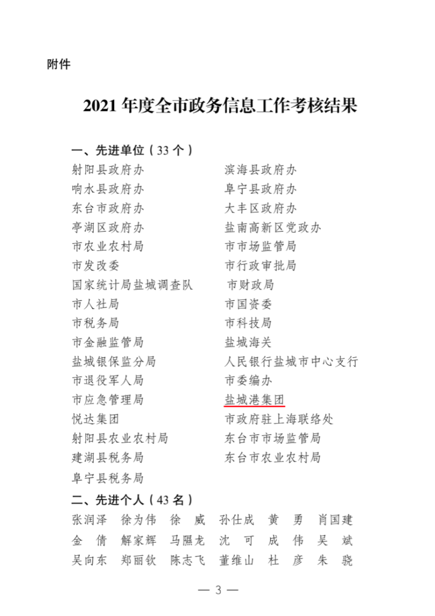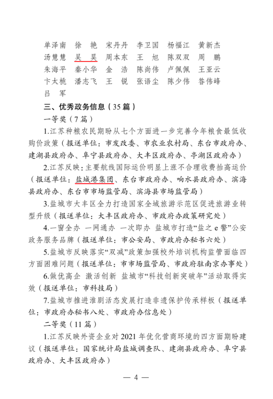 3月8日,市政府辦公室公布2021年度全市政務信息工作考核結果,集團獲評“2021年全市政務信息工作先進單位”,位列市直報點單位前列。同時,我集團參與報送的《江蘇反映:主要航線國際運價明顯上漲不合理收費抬高運價》榮獲優秀政務信息一等獎。集團新聞條線一名同志獲“2021年全市政務信息工作先進個人”稱號。
