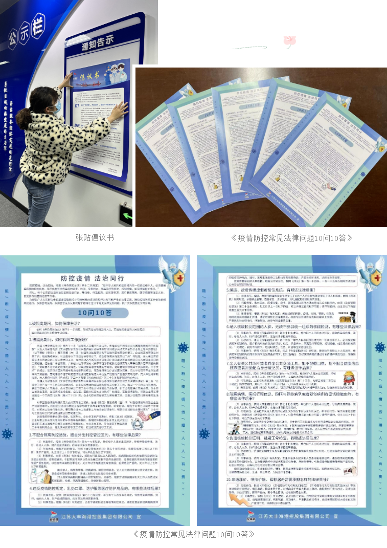 按照“該亮亮起來、該響響起來、該貼貼起來、該發發到位”的防疫宣傳要求,大豐港區運用“網、端、微、屏”等媒體平臺,全方位、多聲部宣傳《防控新冠肺炎疫情相關注意事項》《中華人民共和國傳染病防治法》等法律法規,做到普法宣傳全覆蓋,并將疫情防控宣傳資料、《疫情防控常見法律問題10問10答》等材料發放到各級子公司,要求在重點場所張貼“防控疫情、法治同行”、“全民佩戴口罩”的宣傳海報,依法強化新型冠狀病毒感染的肺炎疫情防控,切實履行疫情防控普法宣傳責任,為堅決打贏疫情防控阻擊戰創造良好法制氛圍。