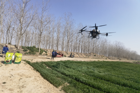 農業集團按區域制定生產服務指導方案,組建“黨員志愿隊”進行志愿服務、實行區域網格化管理、建立微信群及時發布指導意見。為減少勞務人員聚集,提高效率,“黨員志愿隊”為種植戶提供“飛防”服務,100斤的肥料只需短短幾分鐘的時間就可以播撒完成。“網格員”直接到田間地頭,現場指導種植戶種植、病蟲害防治要點,還提供全天候“云指導”服務,確保實現糧食豐收。