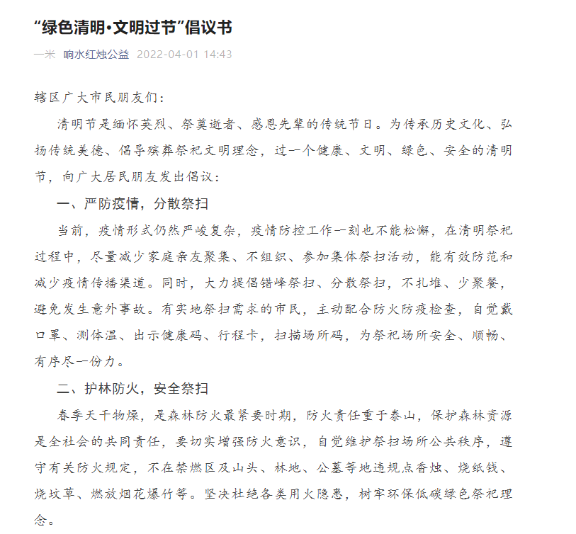 沒有一個冬天不可逾越,沒有一個春天不會到來。非常時期的特殊清明,堅守,就是一份力量;平安,就是一份希望。響水港區(qū)青年志愿者與您同行,從現(xiàn)在做起、從自身做起、從點滴做起,做文明祭掃的踐行者、傳統(tǒng)文化的傳承者、告別陋習的先行者,為守護青山綠水,建設美麗港城作出自己應有的貢獻。