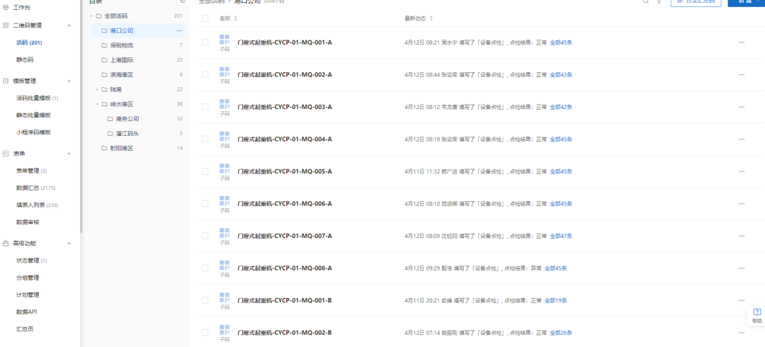 現場維護保養人員通過掃描港口設備上的二維碼,即可將設備維修、點檢和保養記錄錄入設備二維碼中,后臺數據實時更新,管理人員可隨時隨地查看全集團港口設備的運行情況,實現集團集中掌握全部港口設備的運行狀態,提升了設備管理效率,對出現的問題能夠及時解決。同時,利用大數據匯總分析設備的整體狀態,可以對設備后期的采購、維護保養提供一定建議。