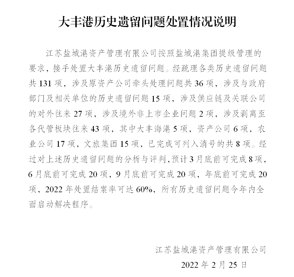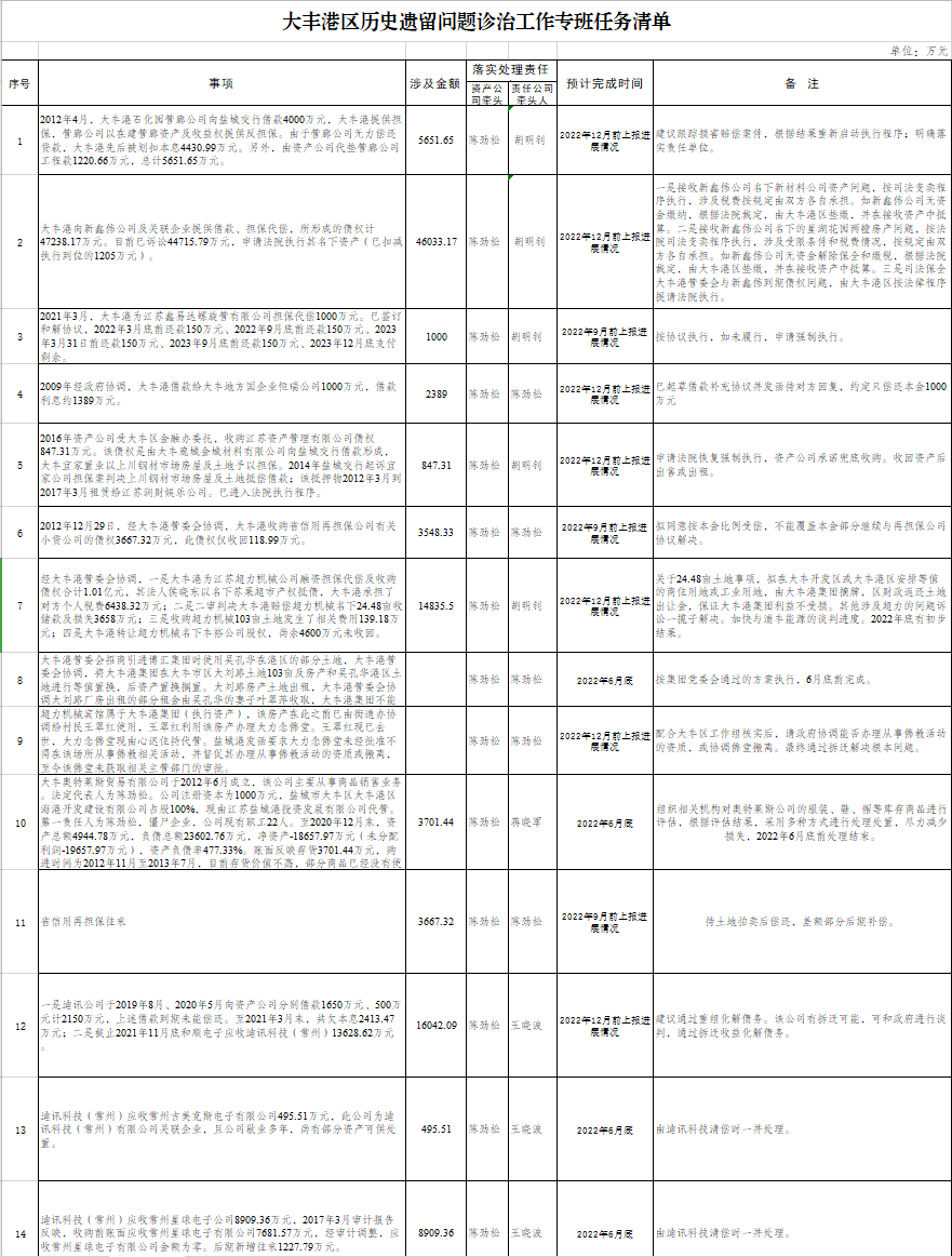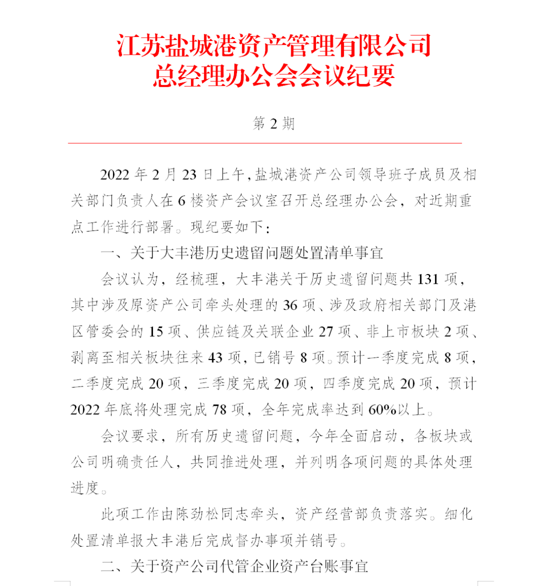 在“六清”的基礎(chǔ)上,梳理大豐港區(qū)歷史遺留問(wèn)題診治工作專(zhuān)班任務(wù)清單計(jì)97項(xiàng),并完成任務(wù)清單說(shuō)明;完成江蘇大豐海港控股集團(tuán)有限公司涉及“國(guó)企債券專(zhuān)項(xiàng)審計(jì)調(diào)查發(fā)現(xiàn)問(wèn)題整改工作”,并將整改工作采取的措施和整改進(jìn)展情況等形成工作報(bào)告上報(bào)大豐區(qū)國(guó)資委;共計(jì)處理處置大豐港區(qū)歷史遺留有問(wèn)題往來(lái)74筆,金額8.09億元。截至5月31日已完成大豐港區(qū)歷史遺留問(wèn)題診治工作專(zhuān)班任務(wù)清單計(jì)15項(xiàng),涉及金額2.81億元。