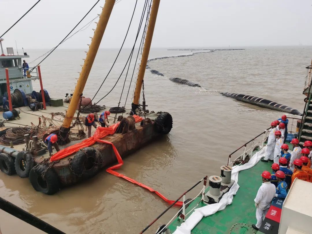 隨后,溢油演習(xí)正式開(kāi)始,“左舷船中錨機(jī)壓管漏油啦!”“新海鯉”輪船長(zhǎng)接報(bào)后立即拉響了防油污警報(bào),同時(shí)船長(zhǎng)通過(guò)全船廣播告知溢油地點(diǎn),根據(jù)應(yīng)變部署要求,立即切斷漏油源頭,控制油污流入海面,清理甲板現(xiàn)場(chǎng)污油。同時(shí)上報(bào)施工項(xiàng)目部,項(xiàng)目部組織“航工301”、“茸洋168”、“海盛189”輪立即趕赴灌河口航道轉(zhuǎn)運(yùn)點(diǎn)參與新海鯉輪的水面油污清理工作,通過(guò)各輪齊心協(xié)作,成功完成清污工作。