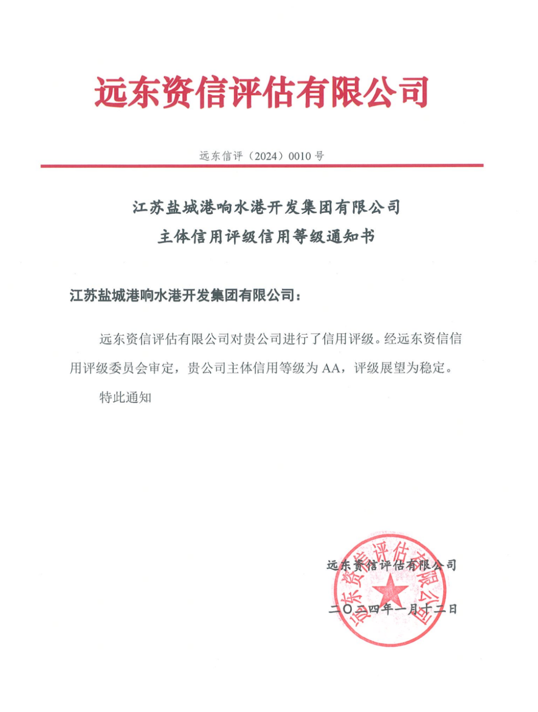 近日,遠(yuǎn)東資信信用評(píng)級(jí)委員會(huì)審定,江蘇鹽城港響水港開(kāi)發(fā)集團(tuán)有限公司成功取得AA主體信用評(píng)級(jí),評(píng)級(jí)展望為穩(wěn)定。