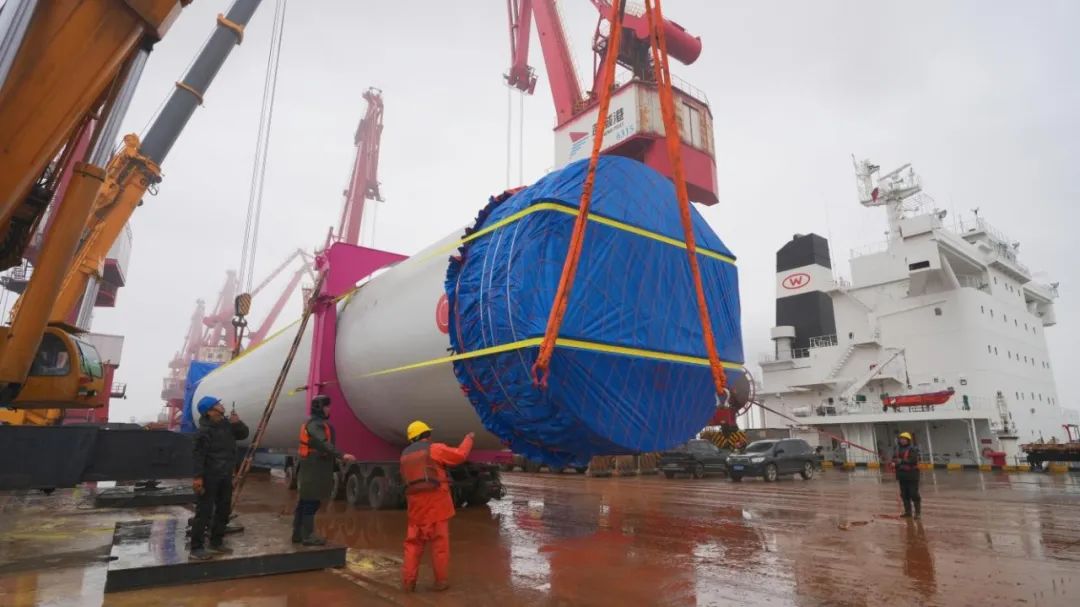 據介紹,新型旋筒船用風帆系統是利用風能來驅動船舶的新技術,是船舶行業綠色發展和智能化操控的一種全新模式,對于推動船舶運輸行業綠色低碳發展具有重要示范意義,船用風力風帆主梁更是船舶風帆制造中的關鍵部件,承擔著船舶行駛過程中節能減排的重要任務。作為一種新型件大量重的超大件貨物,在裝卸、運輸、堆放等作業過程中,需要高度的專業性和嚴謹性。
