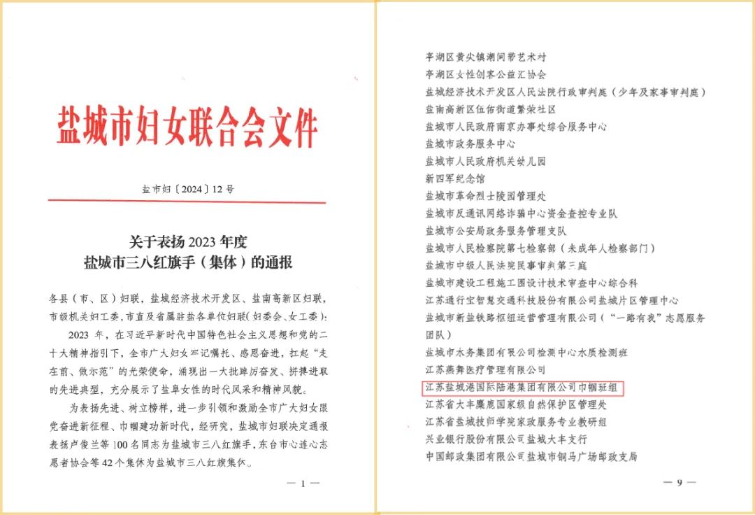 近日,鹽城市婦女聯(lián)合會發(fā)布《關(guān)于表揚2023年度鹽城市三八紅旗手(集體)的通報》,江蘇鹽城港國際陸港集團(tuán)有限公司巾幗班組被評為“2023年度鹽城市三八紅旗集體”。