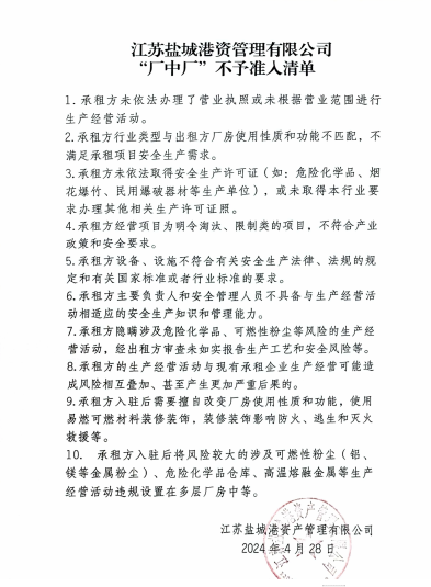 (三)加強(qiáng)風(fēng)險源頭管控,制定不予準(zhǔn)入清單,出租的廠房須滿足承租項目安全生產(chǎn)需求,違反規(guī)定改變廠房使用性質(zhì)、不符合工程建設(shè)安全標(biāo)準(zhǔn)的不得出租;承租項目必須符合產(chǎn)業(yè)政策和安全要求,存在突出風(fēng)險相互疊加或重大事故隱患未按規(guī)定整改等問題的要堅決清退,不具備安全生產(chǎn)條件以及明令淘汰、限制類項目不得租賃廠房進(jìn)行生產(chǎn)。不予準(zhǔn)入清單報屬地監(jiān)管部門審核。