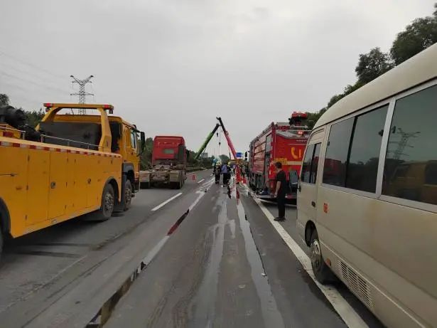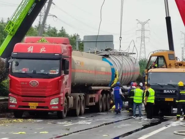 根據(jù)現(xiàn)場險情,公安交警部門第一時間封鎖事故現(xiàn)場,禁止一切車輛靠近,消防大隊出動消防車對事故車輛罐體進行噴射冷卻,聯(lián)系吊車對其進行罐體扶正工作,隨后由危化品運輸公司救援搶險隊使用相關(guān)設(shè)備將泄漏罐車內(nèi)的“高沸點芳烴”進行抽取,并轉(zhuǎn)移至指定安全區(qū)域。