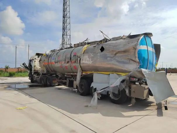在接到大豐區(qū)交通運輸部門指令,危化品運輸公司緊急啟動應急預案,立即組織救援搶險隊,調(diào)集油罐車輛趕赴現(xiàn)場,協(xié)同臨時應急救援領(lǐng)導小組制定救援方案,并實施救援。