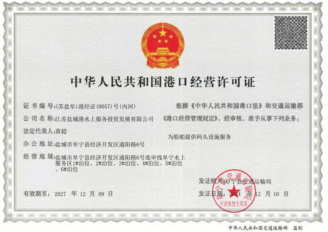 數(shù)月來,經(jīng)過交通部門現(xiàn)場指導(dǎo),對照清單要求,水上服務(wù)公司工作專班第一時(shí)間匯總遞交各類辦證資料,先后完成環(huán)評、安評、安全應(yīng)急預(yù)案、沉降檢測等項(xiàng)目。水上服務(wù)區(qū)高質(zhì)量完成設(shè)計(jì)批復(fù)的工程內(nèi)容,驗(yàn)收資料齊全,滿足竣工驗(yàn)收條件,碼頭項(xiàng)目順利通過竣工驗(yàn)收,并于12月9日順利取得《中華人民共和國港口經(jīng)營許可證》,獲準(zhǔn)水上服務(wù)公司從事為船舶提供碼頭設(shè)施服務(wù)。