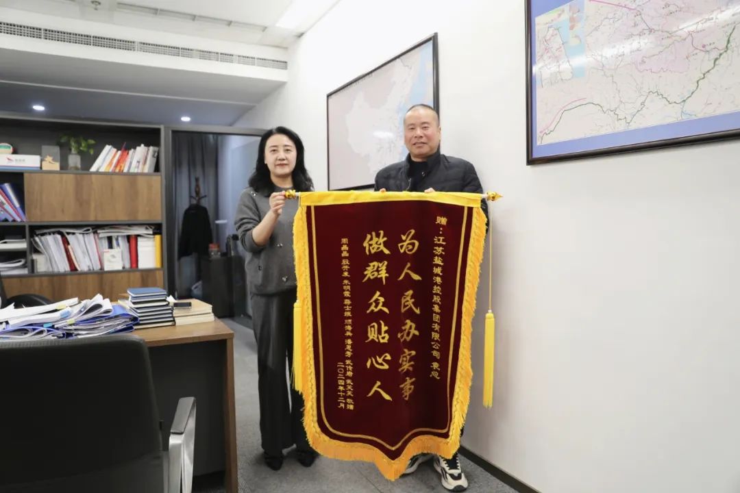 12月24日,多名群眾自發將一面寫有“為人民辦實事 做群眾貼心人”的錦旗送到鹽城港集團,感謝鹽城港集團副總經理袁欣帶領團隊幫助民眾解難題、辦實事。