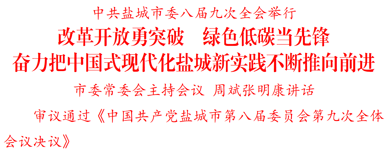 12月29日,中國共產黨鹽城市第八屆委員會第九次全體會議舉行。全會堅持以習近平新時代中國特色社會主義思想為指導,深入貫徹落實黨的二十屆三中全會、中央經濟工作會議和省委十四屆八次全會、省委經濟工作會議精神,總結今年工作,部署明年任務,動員全市上下進一步全面深化改革開放,堅定不移推動綠色低碳發展,高質量完成“十四五”規劃目標任務,奮力把中國式現代化鹽城新實踐不斷推向前進。