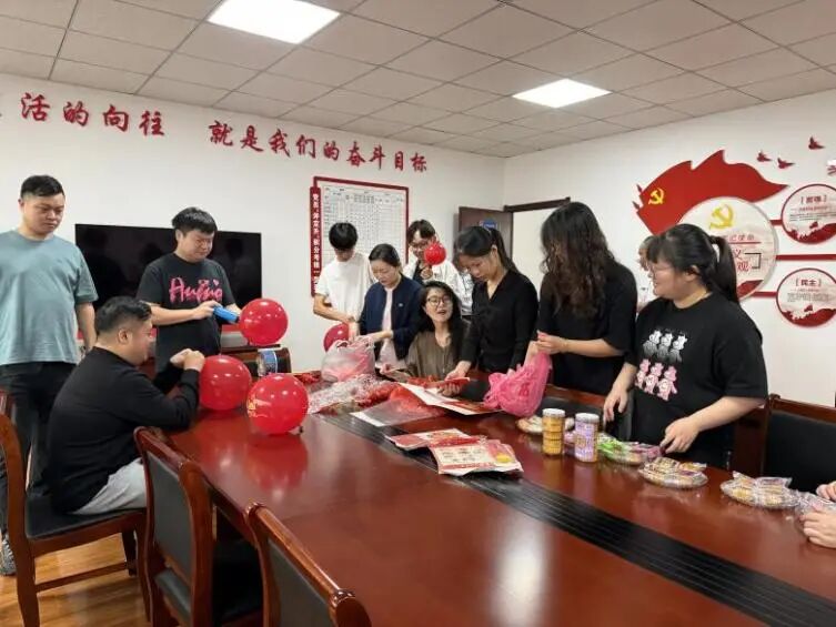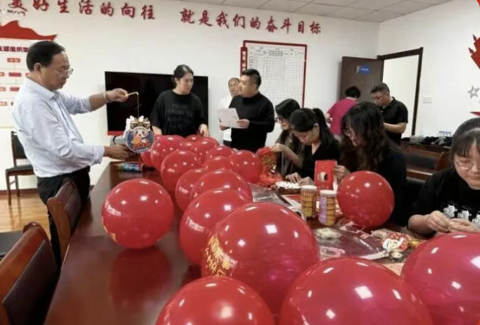 活動伊始,紅色的國旗與五彩氣球便在指尖翻飛成景。員工們分工協作,掛燈籠框架、鋪賞月桌布,半小時內,活動室已氤氳著雙重喜慶——墻面的國旗輝映著案頭的桂花枝,提前備好的兔形燈架靜待添彩,節日的熱鬧氛圍瞬間拉滿。