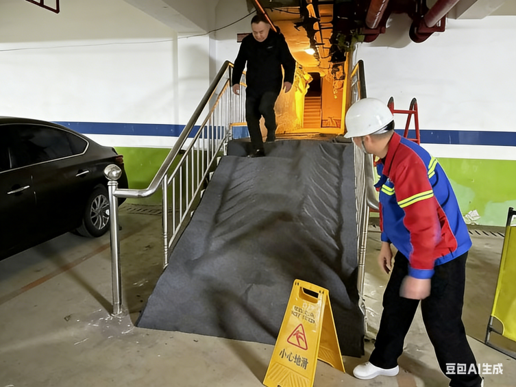 險情就是命令,處置刻不容緩。搶險人員攜專業(yè)搶修工具、備用管材火速進場,與現(xiàn)場協(xié)調(diào)組實現(xiàn)無縫銜接。為防范業(yè)主滑倒受傷,工作人員規(guī)范鋪設(shè)防滑警示帶與防滑地毯,醒目設(shè)置安全標(biāo)識,有序引導(dǎo)人流繞行;搶險組依據(jù)消防管網(wǎng)分布圖精準(zhǔn)定位閥門,果斷執(zhí)行分區(qū)關(guān)閥止水操作,迅速切斷漏水源頭,有效遏制險情進一步蔓延。