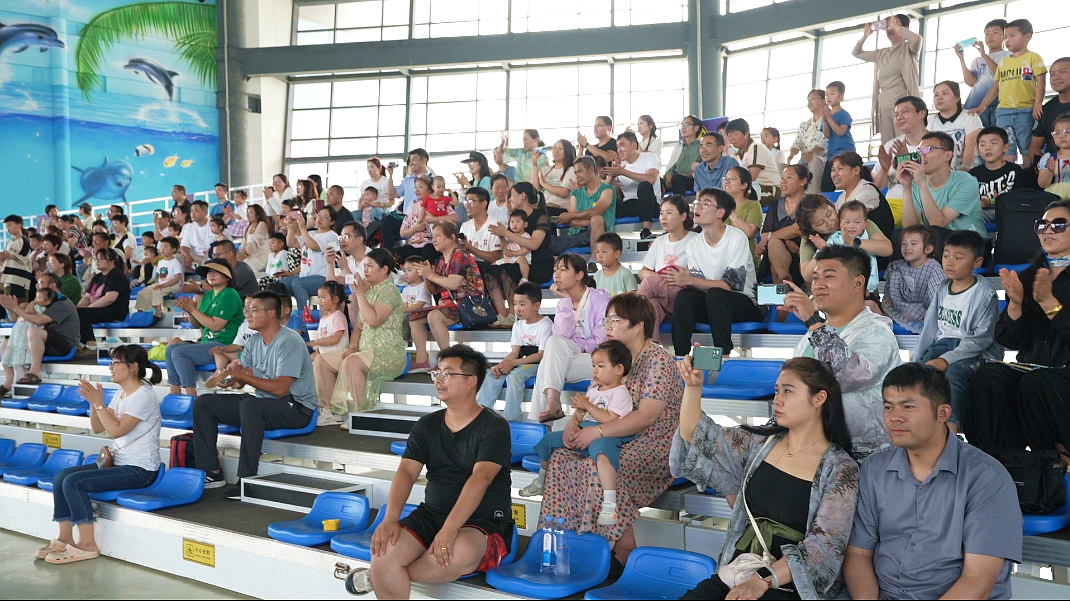在海洋世界里,可愛的海豚在馴養員的指揮下盡情地舞動著,從水中一躍而上而又輕輕落入水中,展現著靈活的身姿。海豚的精彩表演和與觀眾的親密互動,贏得游客陣陣喝彩和掌聲。