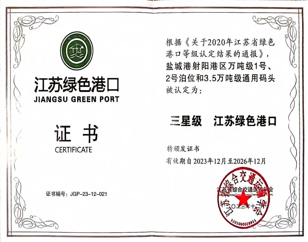 射陽(yáng)港區(qū)獲得“江蘇省三星級(jí)綠色港口”榮譽(yù)稱號(hào)