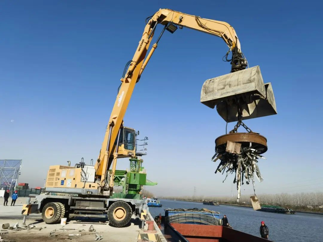 為切實解決作業(yè)效率低下的問題,亭湖港區(qū)調(diào)度組與創(chuàng)新團隊多次研究,最終確定使用抓料機作業(yè),同時為防止抓料機抓取廢鋼對抓斗造成損傷,團隊還特別制定抓料機改造方案,通過兩根定制鋼絲繩將電磁吸盤安裝到抓料機抓斗下方,并通過電纜線路改造,抓料機駕駛員可以在駕駛抓料機的同時操控吸盤。由于抓料機的靈活機動,可以自由伸縮抓臂,作業(yè)現(xiàn)場不再需要裝載機司機的參與。自改造實施后,港區(qū)廢鋼生產(chǎn)作業(yè)耗時耗力的難題得到了有效解決,極大地提高了港區(qū)生產(chǎn)運營效率,該項改進創(chuàng)新在保證安全的基礎上,共節(jié)省人工2名,作業(yè)時長由4天節(jié)省為2天,作業(yè)效率提高50%。