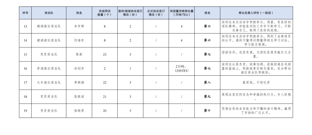 2.簽訂意向協(xié)議數(shù)量147份:其中大豐港區(qū)突擊隊56份,黨員突擊隊21份,響水港區(qū)突擊隊19份,濱海港區(qū)突擊隊11份,巾幗突擊隊9份,射陽港區(qū)突擊隊6份,航運集團突擊隊5份,亭湖港區(qū)突擊隊5份,建湖港區(qū)突擊隊5份,多式聯(lián)運第一突擊隊5份,多式聯(lián)運第二突擊隊3份,阜寧港區(qū)突擊隊2份。