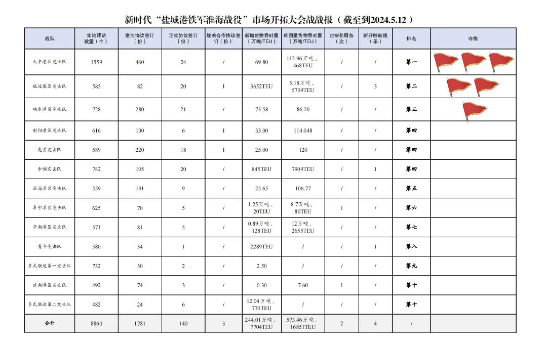 1.累計拜訪客戶數量8860家:其中大豐港區(qū)突擊隊1559家,巾幗突擊隊742家,多式聯運第一突擊隊732家,響水港區(qū)突擊隊728家,阜寧港區(qū)突擊隊625家,射陽港區(qū)突擊隊616家,黨員突擊隊589家,航運集團突擊隊585家,青年突擊隊580家,亭湖港區(qū)突擊隊571家,濱海港區(qū)突擊隊559家,建湖港區(qū)突擊隊492家,多式聯運第二突擊隊482家。
