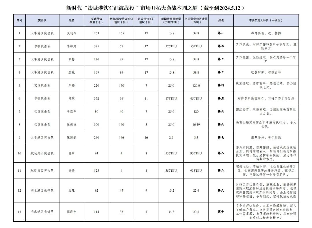 第一名:大豐港區(qū)突擊隊 夏迎冬(拜訪客戶263家,簽訂意向協議165份,簽訂正式協議17份,新增貨物吞吐量13.8萬噸,鞏固量貨物吞吐量39.8萬噸);