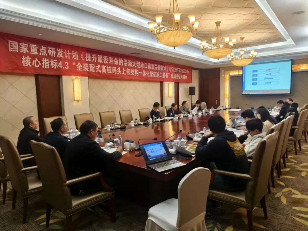 本工程位處大豐港區(qū)開敞海域,常年風浪大,最大潮差達到6米,漲落潮流急,傳統(tǒng)浮式起重船無法完成上部結構施工。為解決惡劣海況下碼頭上部結構快速安裝問題,為項目量身打造的智能筑港機,該設備配備了數(shù)字監(jiān)控平臺,在安裝下放過程中,系統(tǒng)自動識別梁板安裝目標位置圖像后,將構件快速、平穩(wěn)、精準落入,實現(xiàn)全過程智能安裝。全裝配式高樁碼頭上部結構一體化智能施工裝備是國家重點研發(fā)計劃項目的核心指標,趁此階段項目組組織召開了現(xiàn)場見證考核會,邀請來自鹽城市交通運輸局、鹽城市港航事業(yè)發(fā)展中心、鹽城市交通規(guī)劃設計院等單位的專家到現(xiàn)場進行見證考核,經(jīng)過現(xiàn)場考察、會議審查及資料查閱,一致認為達到了考核指標要求,至此該裝備研發(fā)在此項目上的科技創(chuàng)新示范應用得到了有力的成功驗證。