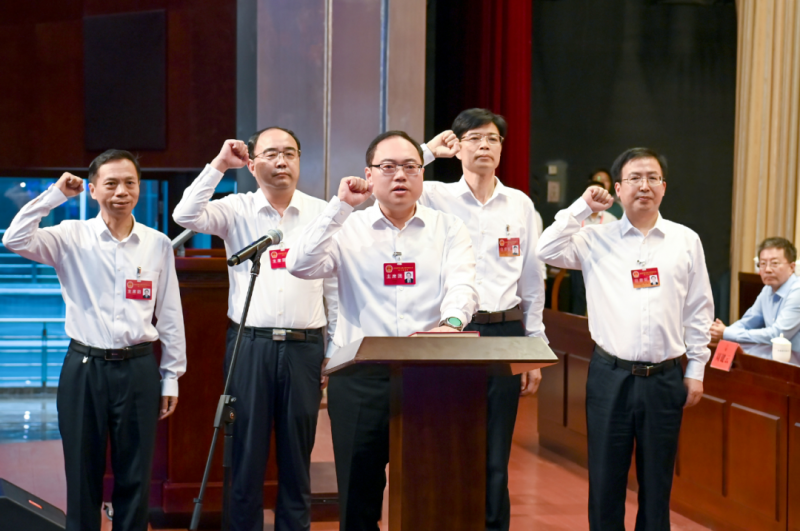 在全體代表的監(jiān)誓下,新當(dāng)選的市長(zhǎng)和市人大常委會(huì)委員進(jìn)行了莊嚴(yán)的憲法宣誓。