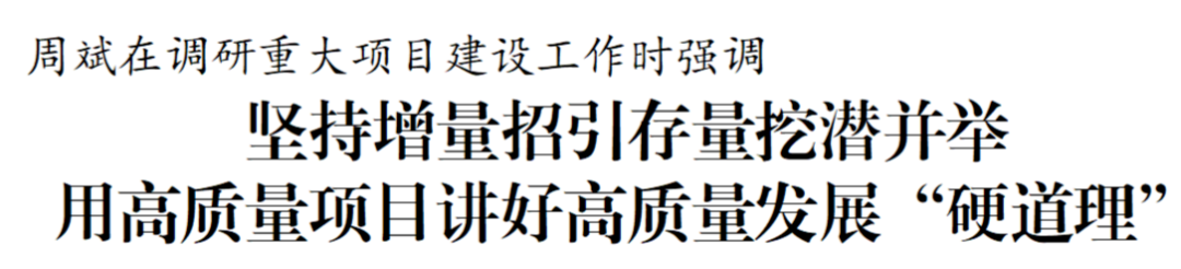 周斌在調研中強調,重大項目是經濟社會高質量發展的“加速器”和“壓艙石”。今年各項工作已經進入下半場,各地各部門要增強時不我待的緊迫感,堅持一切圍著項目轉、一切盯著項目干,推動重大項目建設跑出“加速度”,用高質量項目講好高質量發展“硬道理”。要堅持增量招引和存量挖潛并舉,既注重招引新項目、好項目,又鼓勵引導現有企業開展“智改數轉網聯”、技改擴能項目投資。要積極推動制造業數字化轉型,促進專精特新企業蓬勃發展,培育壯大智能產業,加快構建現代化產業體系,為推進中國式現代化鹽城新實踐提供堅實支撐。