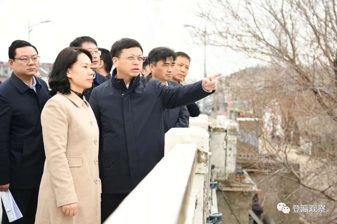 ▲市長曹路寶察看鹽都區(qū)龍岡鎮(zhèn)鳳凰橋航段現(xiàn)場(chǎng)