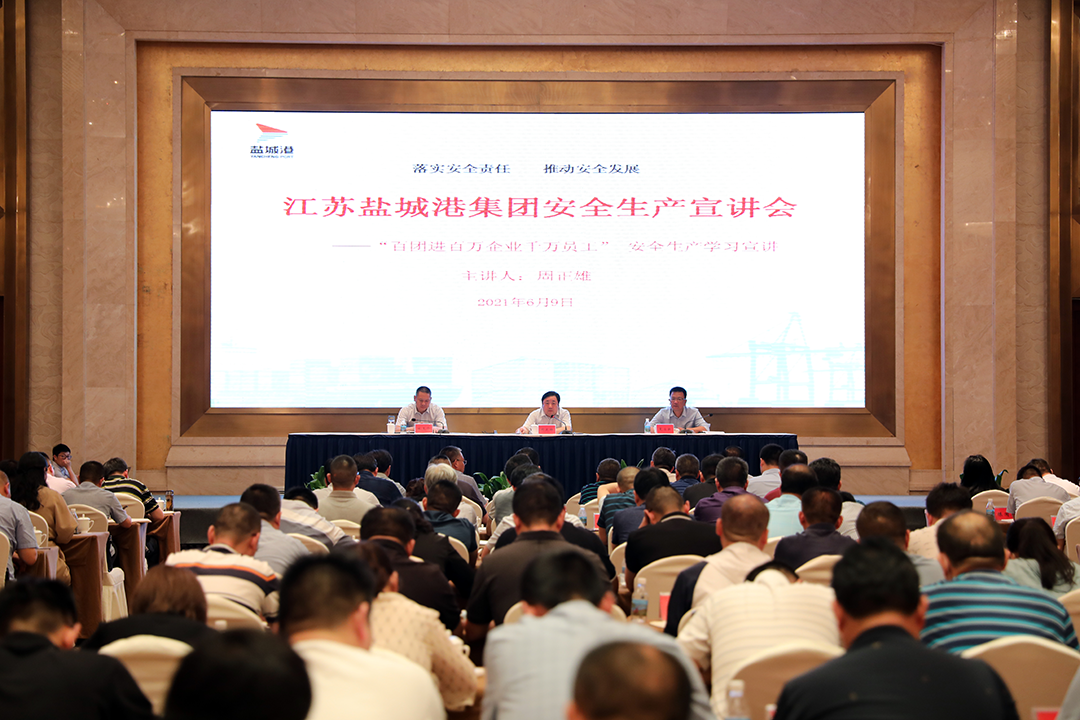 根據省、市安全生產宣講活動安排,6月9日,鹽城港集團在大豐港區召開“百團進百萬企業千萬員工”安全生產學習宣講會議,集團黨委書記、董事長、總經理周正雄出席會議并作主題宣講。他強調,要深入學習貫徹習近平總書記關于安全生產的重要論述,牢固樹立以人民為中心的發展思想,把安全生產紅線意識貫穿于集團發展各領域和全過程,以更加有力有效的措施防范化解安全風險,以更高標準守牢安全底線,確保集團安全生產形勢持續穩定向好,為集團“十四五”開好局、起好步營造穩定發展環境。