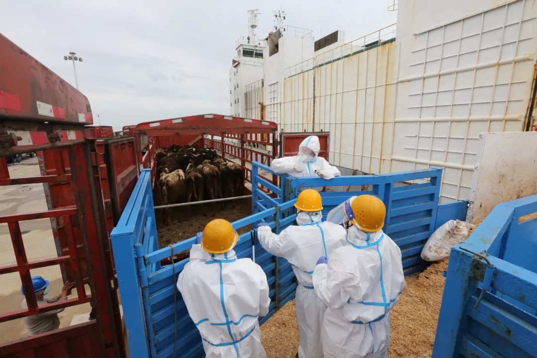 早在船舶抵港前一周,鹽城港船舶代理公司便聯系各方召開了船前會,部署安排各項準備工作,及時向船方通報相關要求,同時密切關注航行動態以及活牛健康狀況。到港前,正值強對流天氣多發季節,碼頭人員密切關注天氣狀況,天氣一經轉好便聯系引水拖輪,搶抓窗口期安排船舶進港,同時提前安排轉運車輛消殺進港,船舶靠港后,碼頭工作人員認真組織防疫、消殺工作,在最短時間內完成聯檢工作,為活牛卸船爭取了時間。
