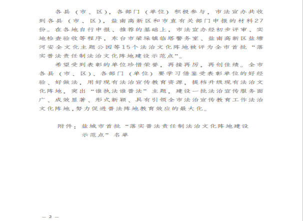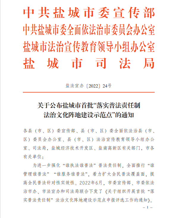 近期,由鹽城市委宣傳部、市委依法治市辦、市法宣辦、司法局4個部門單位發(fā)布關(guān)于公布鹽城市首批“落實普法責(zé)任制法治文化陣地建設(shè)示范點”的通知,江蘇鹽城港射陽港開發(fā)集團有限公司榮獲相關(guān)稱號。
