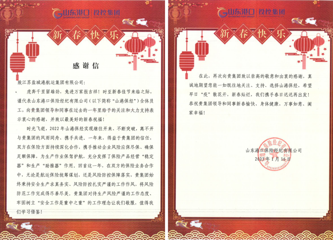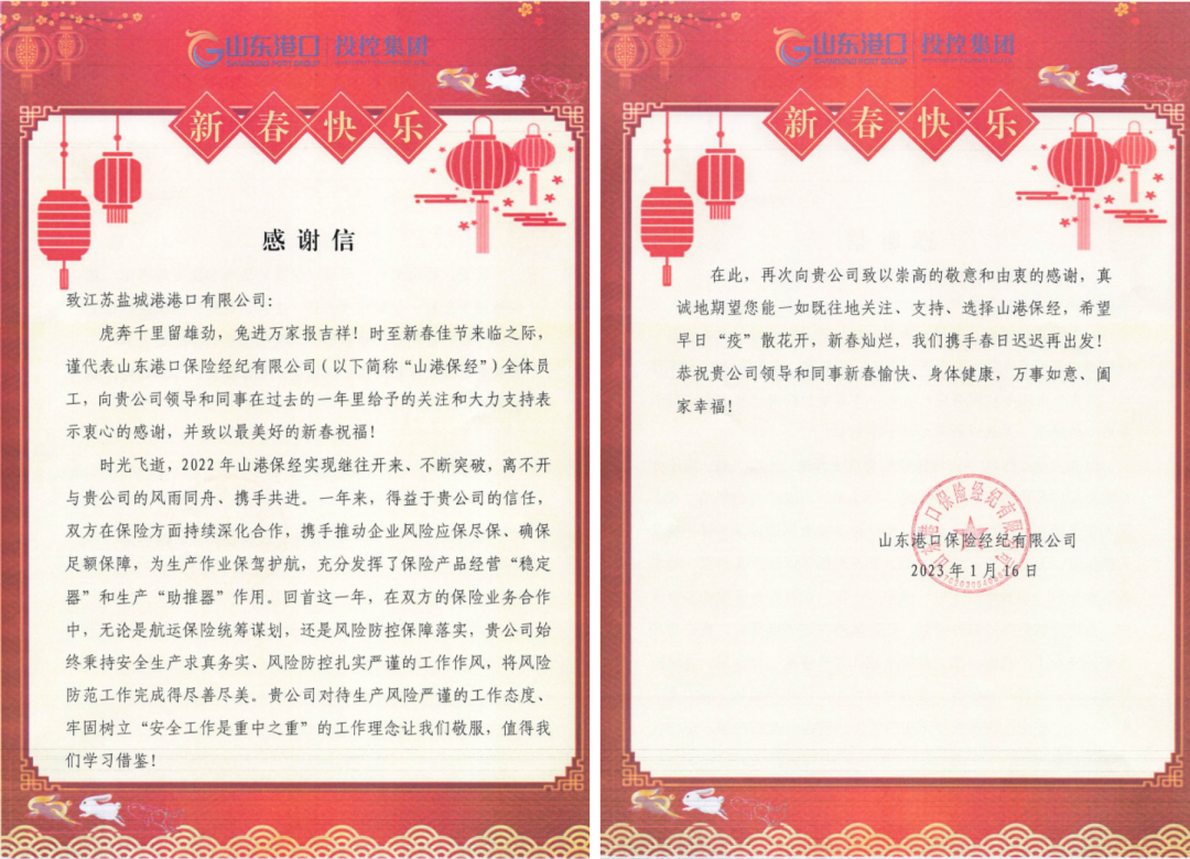 新歲序開,同赴新程。近日,集團(tuán)下屬江蘇鹽城港大豐港開發(fā)集團(tuán)、江蘇鹽城港港口公司、江蘇鹽城港航運(yùn)集團(tuán)三家單位分別收到來自山東港口保險(xiǎn)經(jīng)紀(jì)公司的感謝信。紙短情長,字字暖心。一封封感謝信,道出了鹽城港和山東港攜手發(fā)展的深厚情誼。