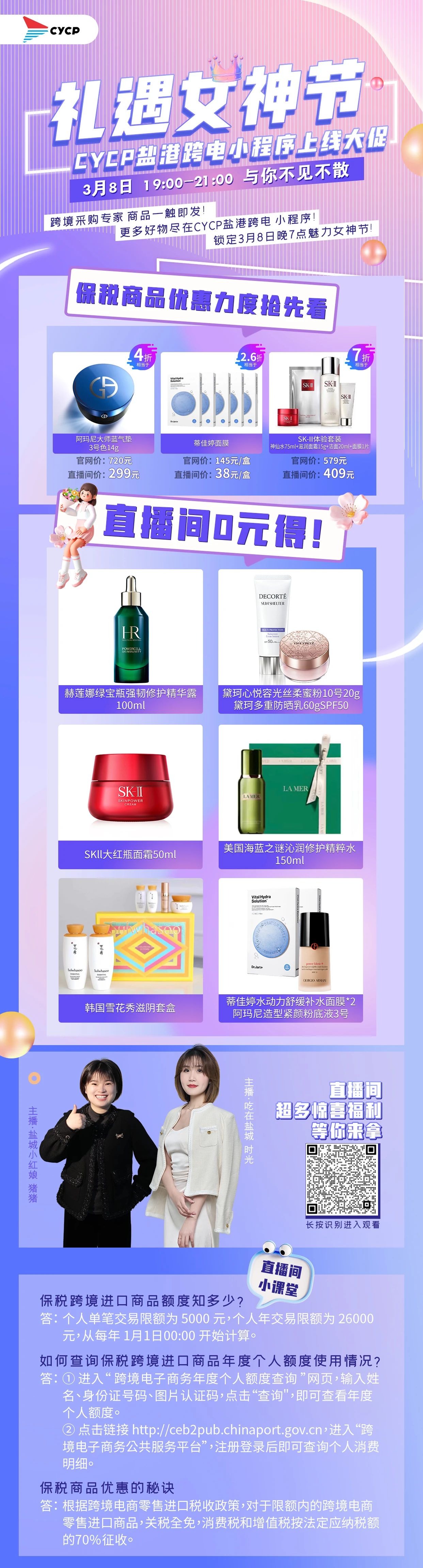 網紅主播線上推介,更有諸多好禮,參與直播間0元得,保稅優品,全球好貨,盡在“CYCP鹽港跨電”直播間,快快掃碼預約直播,千萬別錯過!