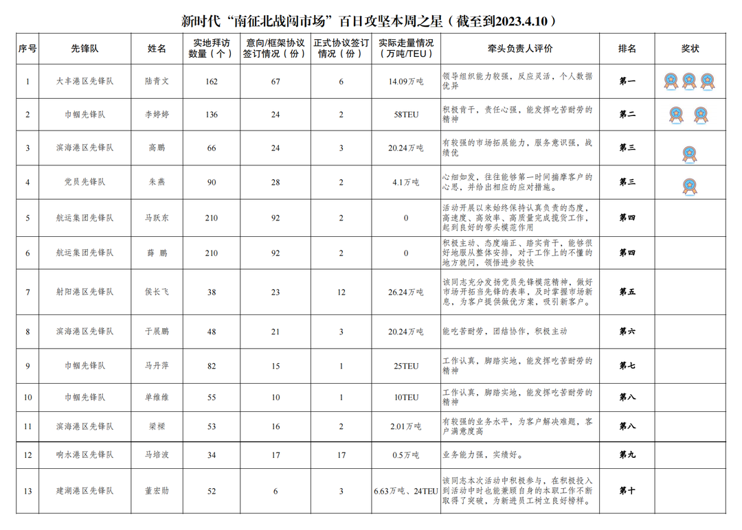 第一名:大豐港區(qū)先鋒隊(duì) 陸青文(拜訪客戶162家,簽訂意向協(xié)議67份,簽訂正式協(xié)議6份,實(shí)際走量14.09萬噸)