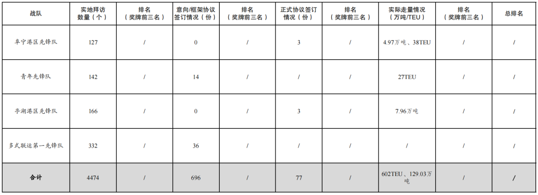 3.簽訂正式協(xié)議數(shù)量77份:其中響水港區(qū)先鋒隊25份,射陽港區(qū)先鋒隊12份,濱海港區(qū)先鋒隊9份,大豐港區(qū)先鋒隊6份,巾幗先鋒隊6份,航運集團先鋒隊5份,黨員先鋒隊4份,建湖港區(qū)先鋒隊3份,亭湖港區(qū)先鋒隊3份,阜寧港區(qū)先鋒隊3份,多式聯(lián)運第二先鋒隊1份。