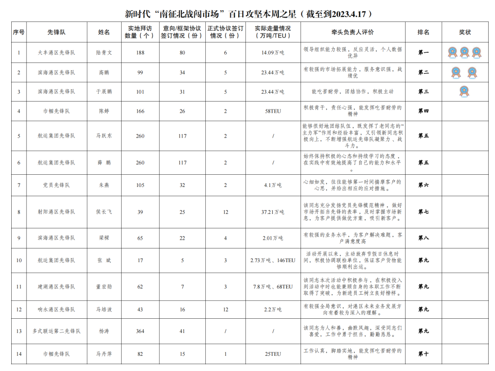 第一名:大豐港區(qū)先鋒隊 陸青文(拜訪客戶188家,簽訂意向協(xié)議80份,簽訂正式協(xié)議6份,實際走量14.09萬噸)