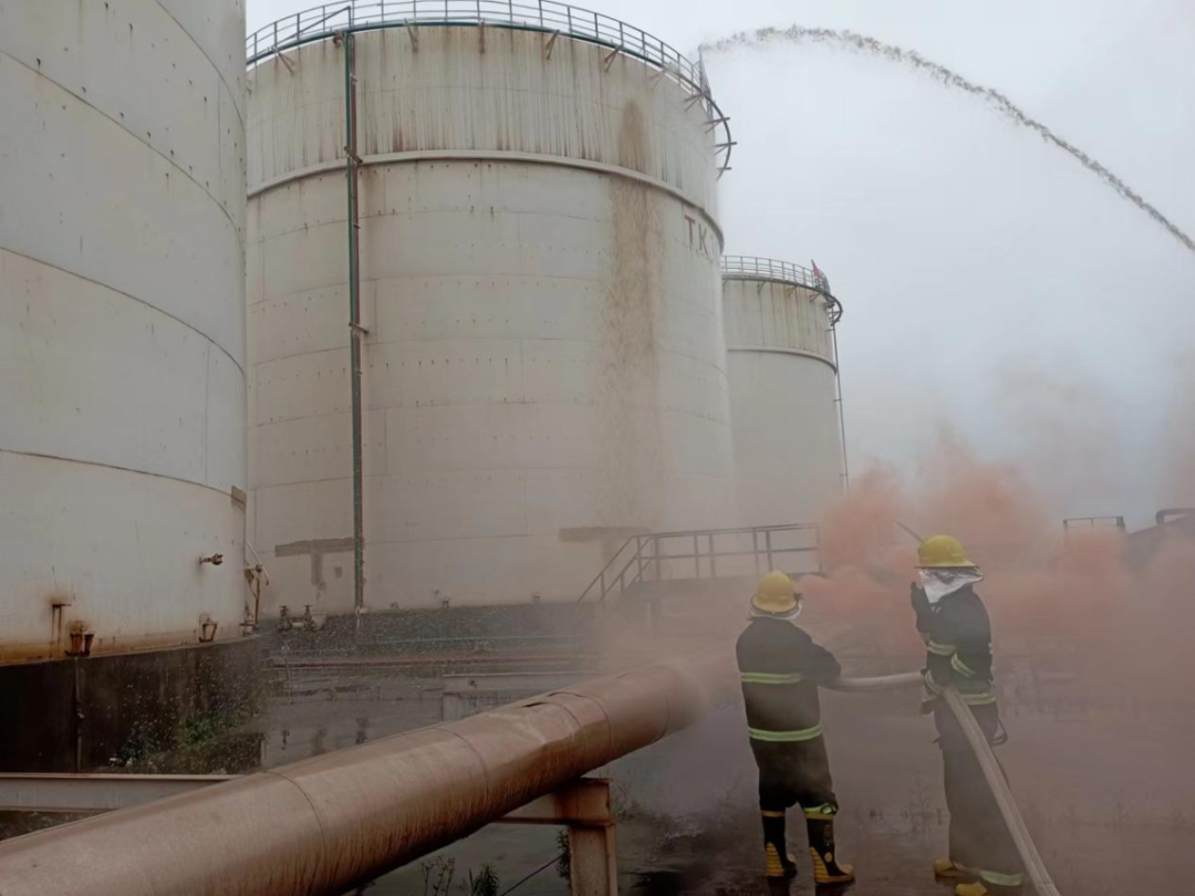 在模擬罐組一泵房法蘭墊破裂發生汽油泄漏引起火災的消防演練中,各小組配合默契、反應迅速、銜接有序、措施果斷,現場忙而不亂,參演人員對指揮人員下達的每一個指令都能夠在第一時間給予回應并立即執行,確保緊急情況下第一時間搶險救援。各小組結合現場情況分析應對初起火災的應急處置流程、周邊消防設備設施的正確使用要領、火災撲救消防安全知識等,同時確保每名職工都能牢牢掌握會報警、會撲救、會疏散的必備消防技能。真正做到掌握消防應急技能,練就過硬本領。